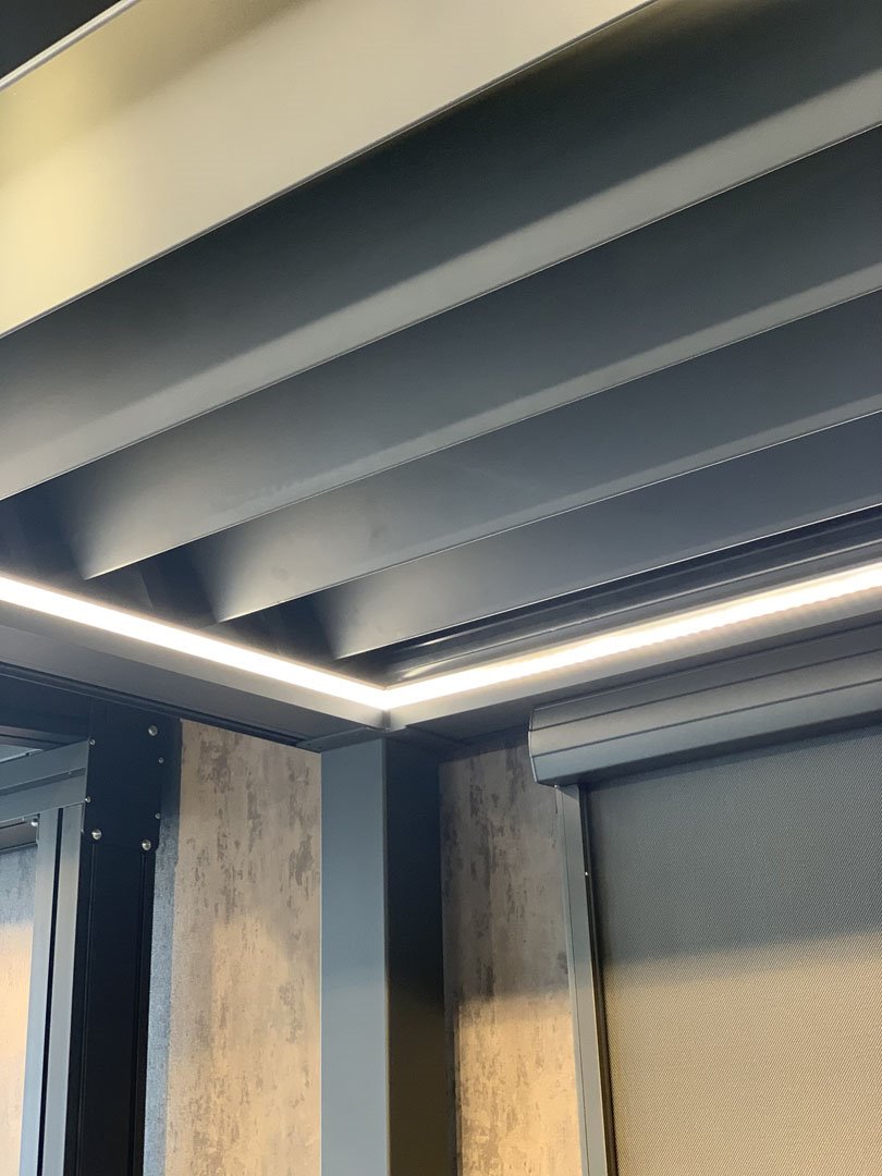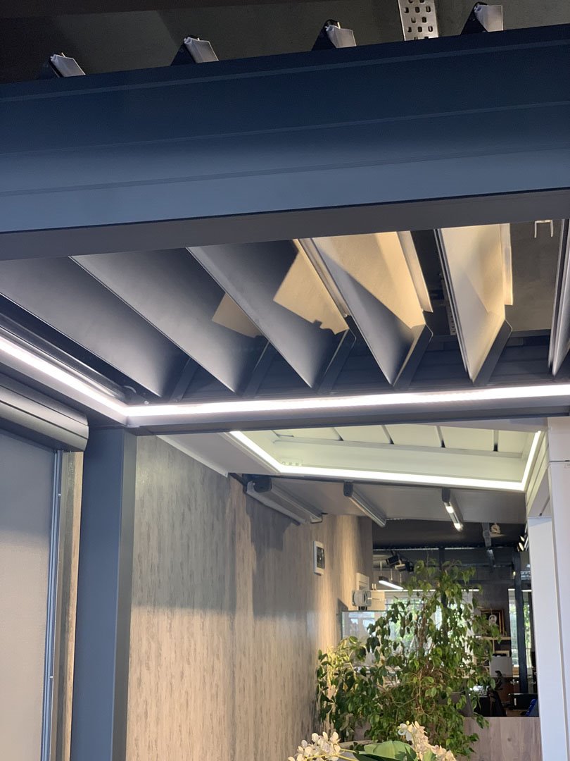 The BOLOGNA Bioclimatic Pergola systems are a modern innovative design that allows energy savings and the use of natural light. Thanks to the tilting fins of the system, BOLOGNA provides a natural microclimate when opened and provide protection from direct sun by adjusting the angle according to the sun.
